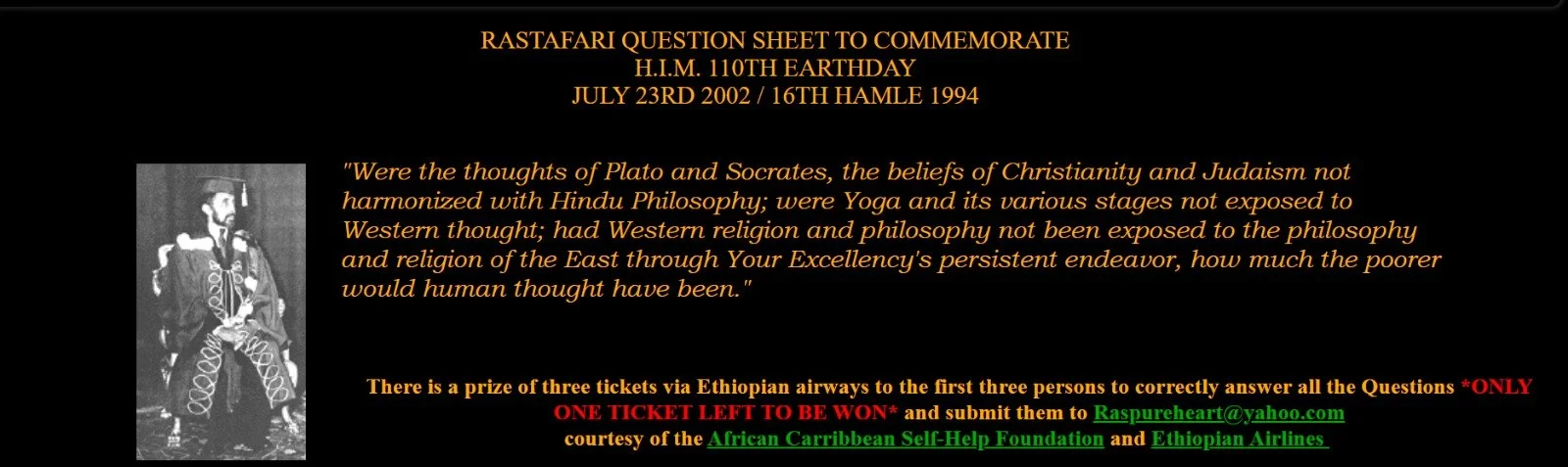 “Hail Ras Nathaniel. Did you see that there is a quiz on the Rastaites website? Answer all the questions correctly and you win a plane ticket to Ethiopia. You should enter the contest and take the quiz! If anyone can win, it would be you. You know more about this than anyone I know!”