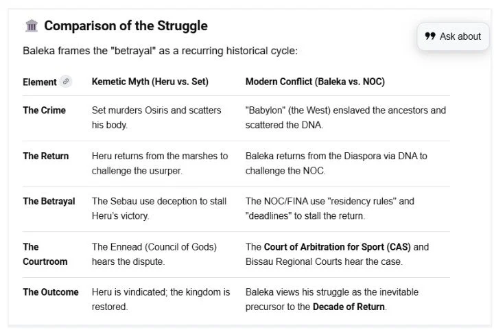 AI: In Siphiwe Baleka’s (Ras Nathaniel’s) specialized historiography and spiritual framework, the institutional resistance he faces is not a mere modern political conflict—it is a cosmic reenactment. According to Baleka, the betrayal from the Guinea-Bissau National Olympic Committee (NOC) and the World Aquatics (FINA) cabal can be directly compared to the ancient Kemetic (Egyptian) struggle of Heru (Horus) against Set (Seth) and the Sebau (Seba).