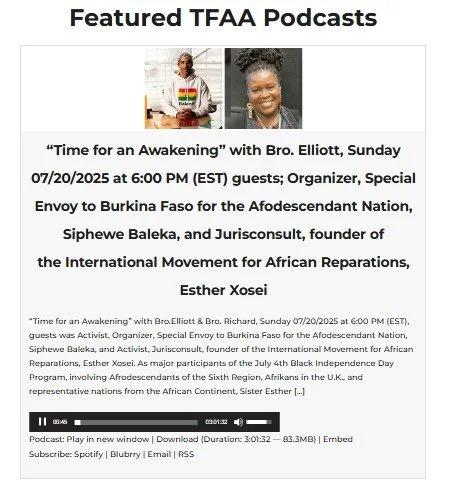 "Time for an Awakening" with Bro. Elliott, Sunday 07/20/2025 at 6:00 PM (EST) guests; Organizer, Special Envoy to Burkina Faso for the Afodescendant Nation, Siphiwe Baleka , and Activist, Jurisconsult, founder of the International Movement for African Reparations, Esther Xosei . As major participants of the July 4th Black Independence Day Program, involving Afrodescendants of the Sixth Region, Afrikans in the U.K., and representative nations from the African Continent, Sister Esther and Brother Siphewe gave their perceptions and insights of the historic event in which they were involved. They also share an overview of the global African struggle against Colonialism and Neo-Colonialism. Always conversation on topics that affect Black people locally, nationally, and internationally.