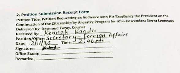 November 12, Freetown - Sixteen Afrodescendants of Mende origin, four Afrodescendants of Temne origin, one descendant of both Mende and Temne origin, and one Afrodescendant of Fula and Kono origin submitted a Petition to the President of the Republic of Sierra Leone, Head of State, His Excellency Julius Maada Bio to Launch a Decade of Return Initiative and Provide Citizenship to the Descendants of the People of Sierra Leonean Origin and Afrodescendants Who were taken from their Ancestral Homeland and Enslaved in the Americas. The petition was delivered through the Ministry of Foreign Affairs.
