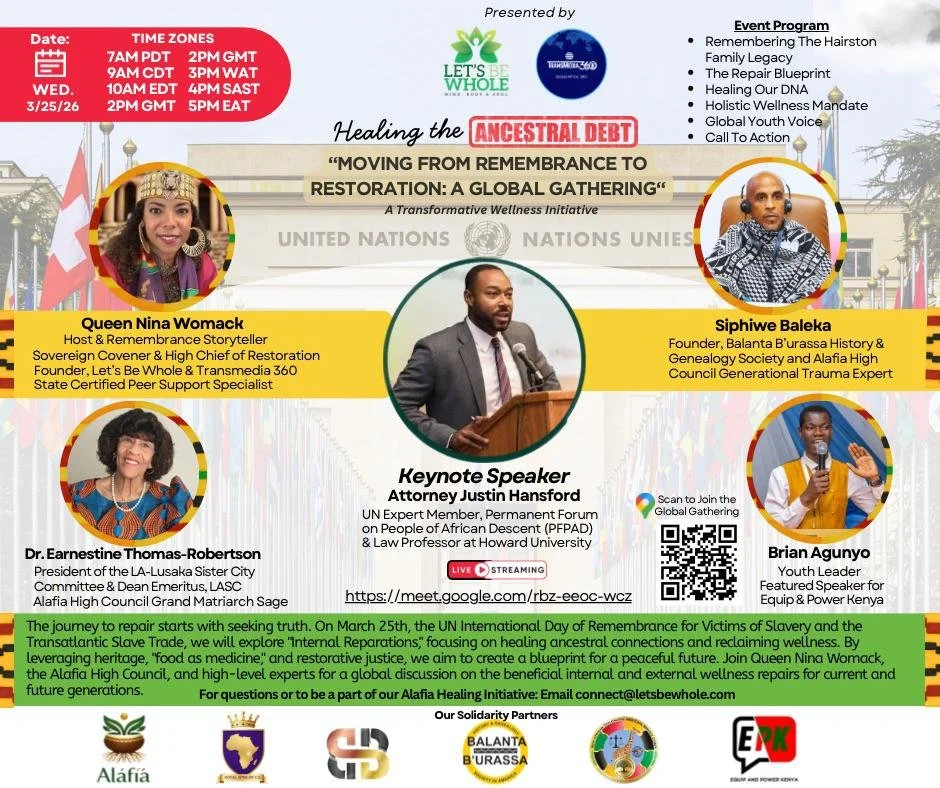 On March 25, 2026, the UN International Day of Remembrance for the Victims of Slavery and the Transatlantic Slave Trad, a historic shift occurred. Watch as we break down the monumental moment President John Mahama took to the UN floor to officially declare the Transatlantic Slave Trade a Crime Against Humanity. In this powerful virtual gathering, we dive deep into the dual necessity of Internal and External Reparations. From the legal frameworks of global justice to the internal healing required within the African Diaspora, this is a conversation the world cannot afford to ignore. Meet the Panel of Experts: Queen Nina Womack (Host) – Cultural Innovator & Global Wellness Advocate; Attorney Justin Hansford – Renowned Human Rights Lawyer & Professor; Siphiwe Baleka – Lineage Restoration and Epigenetics Expert; Dr. Earnestine Thomas-Robertson – Educator & Expert in International Relations; Brian Angunyo – Pan-African Activist & Youth Leader. In this video, we discuss: