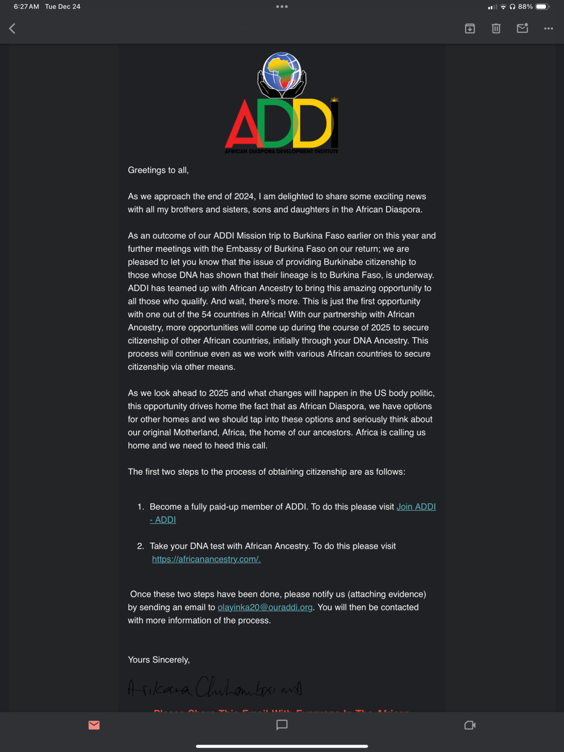 A follow-up nnouncement on January 18, 2025 from the African Diaspora Development Institute (ADDI) states “The government of Burkina Faso has asked ADDI to spearhead a citizenship initiative that invites African Diaspora to apply to be citizens of Burkina Faso” and that President Traore put an executive order in place in which “There will be two Tiers of applications. Tier I=All those who have traced their lineage to Burkina Faso through their DNA. Tier II=Any black Diaspora. The government of Burkina Faso has indicated that the ceremony conferring citizenship will happen in June 2025”. Another announcement on July 14 after the Friends of President Ibrahim Traore in the West (FPITW) delegation’s debriefing following their successful mission to Burkina Faso, the ADDI announced, "The government of Burkina Faso has confirmed that our ADDI mission trip to include the conferment of Burkina Faso citizenship will take place from October 26th to November 8th, 2025.”