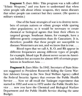"(The US) National Cancer Institute in collaboration with the World Health Organization made the AIDS virus in their laboratories in Fort Dietrich (now NCI). They combined the deadly retroviruses, bovine leukaemia virus and sheep visna virus, and injected then into human tissue cultures. The result was the AIDS virus, the first human retrovirus known to man and now believed to be 100 percent fatal to those infected "