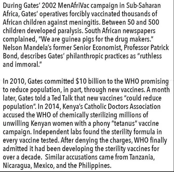 “In 2010, the Gates Foundation funded a trial of a GSK’s experimental malaria vaccine, killing 151 African infants and causing serious adverse effects including paralysis, seizure, and febrile convulsions to 1,048 of the 5,049 children.”