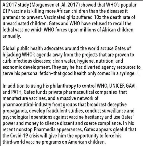 “A 2017 study (Morgenson et. al. 2017) showed that WHO’s popular DTP vaccine is killing more African children than the diseases it prevents. DTP-vaccinated girls suffered 10x the death rate of children who had not yet received the vaccine. WHO has refused to recall the lethal vaccine, which it forces upon tens of millions of African children annually.. . . . Gates appears confident that the Covid-19 crisis will now give him the opportunity to force his dictatorial vaccine programs on all American children – and adults.”