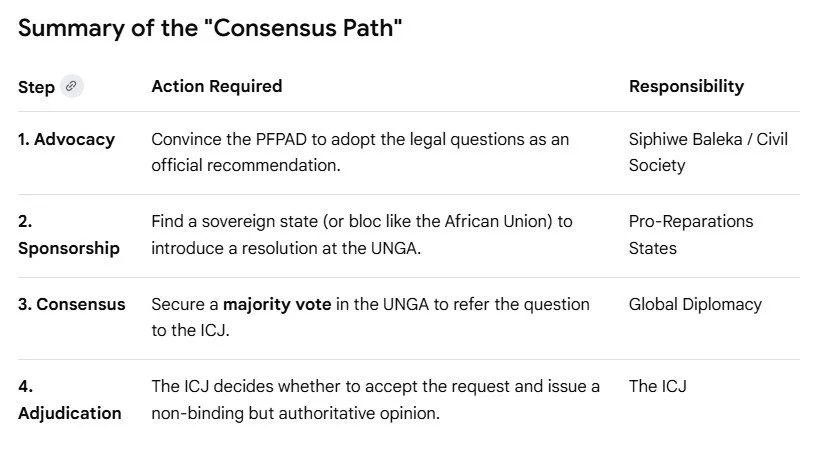 AI: The Balanta Mandate, spearheaded by Siphiwe Baleka, has submitted specific legal questions to the Permanent Forum on People of African Descent (PFPAD) designed to trigger a request for an Advisory Opinion from the International Court of Justice (ICJ). The primary questions and legal arguments include: