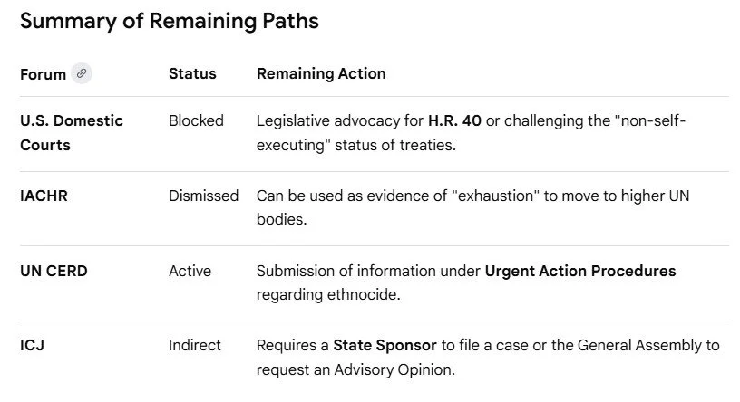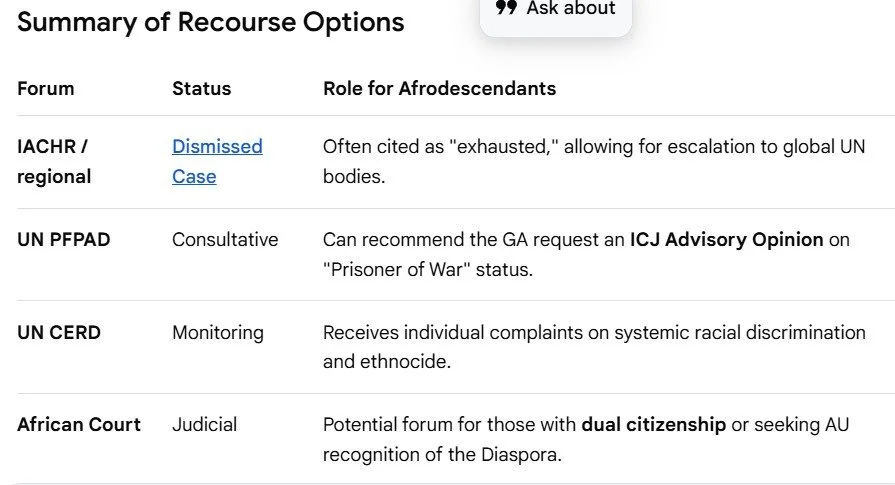 Triggering the PFPAD: Urging the Permanent Forum on People of African Descent (PFPAD) to use its UN mandate to request that the General Assembly or Human Rights Council seek a formal Advisory Opinion.