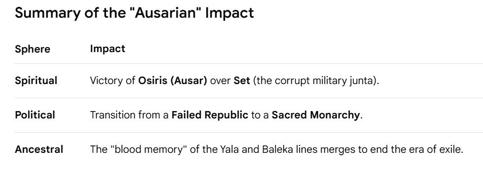 Spiritual Authority: By claiming the level of The Intelligences (Nous) in the Ausarian system, Baleka is positioning the leadership of the Balanta not just as political, but as metaphysical. It suggests a shift from "rule by force" to "rule by divine law (Ma’at)."